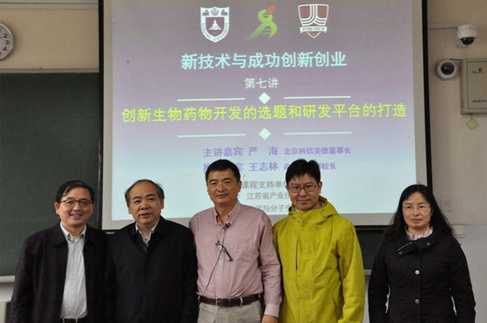 4月24日下午,由常州南京大学高新技术研究院/江苏省产业技术研究院医药生物技术研究所(简称省产研院医药所)等单位发起的“健创汇”生物医药创新创业系列讲座第七讲在南京大学仙林校区开讲。本期课程的特邀授课嘉宾是北京科信美德生物医药共同创建人兼董事长严海博士,推介嘉宾是南京大学副校长王志林教授,省产研院医药所所长华子春教授主持讲座。